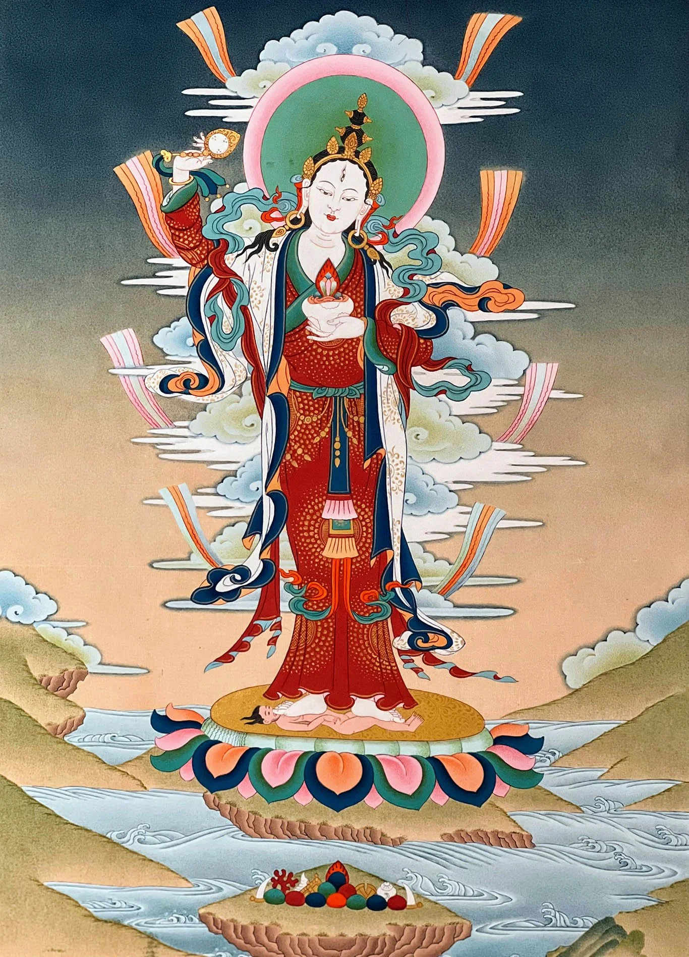 Achi Chokyi Drolma holds a central place in the Drikung Kagyu tradition as its primary Dharma protector. She is regarded as an emanation of Vajrayogini and the great grandmother of the founder of the lineage, Jigten Sumgön. Her deep historical and spiritual ties to the Drikung Kagyu make her an indispensable guardian of its teachings and practitioners. She is known for swiftly dispelling obstacles, clearing away negativity, and assisting those on the path to enlightenment.